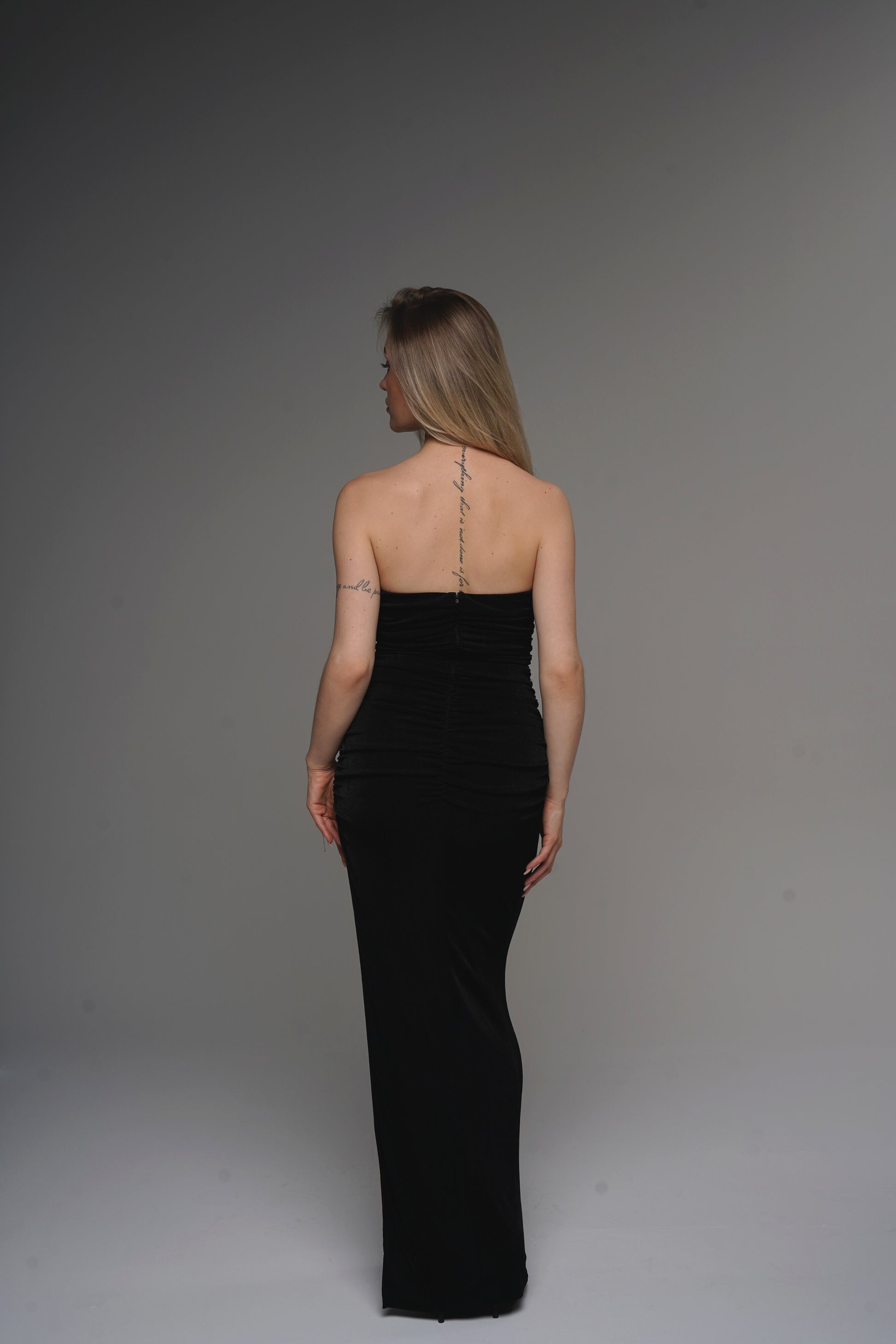 Turn heads in this elegant strapless evening gown, designed to hug your curves in all the right places. Made with soft, stretchy fabric, this dress features flattering ruching along the sides and a dramatic thigh-high slit for added movement and style. The sweetheart neckline and fitted bodice enhance your silhouette, making it perfect for formal events, parties, or a night out.