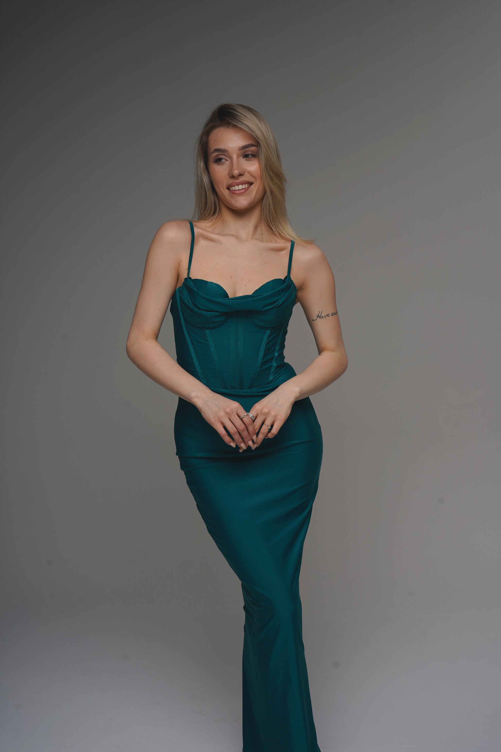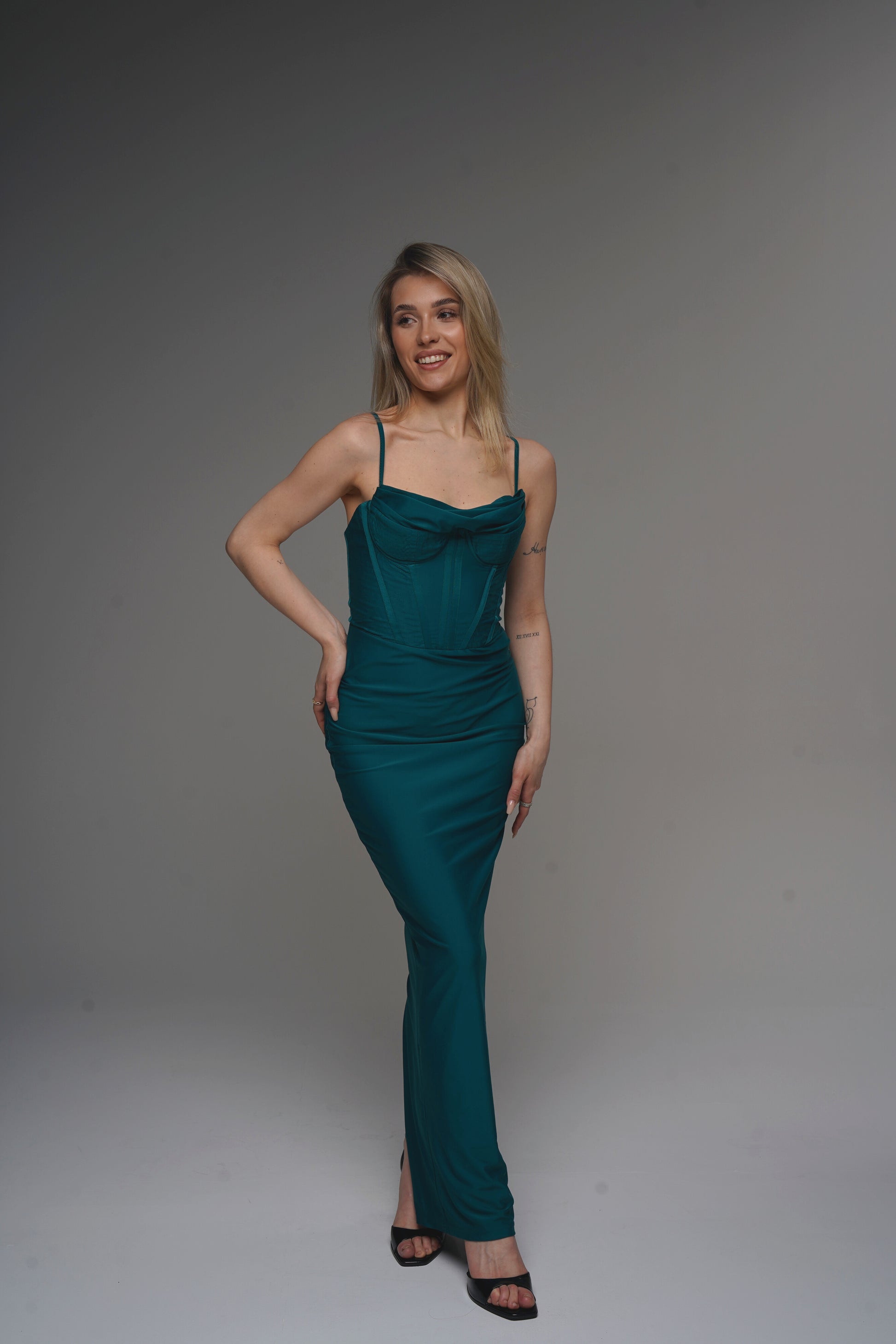 - Maxi length with form-fitting cut